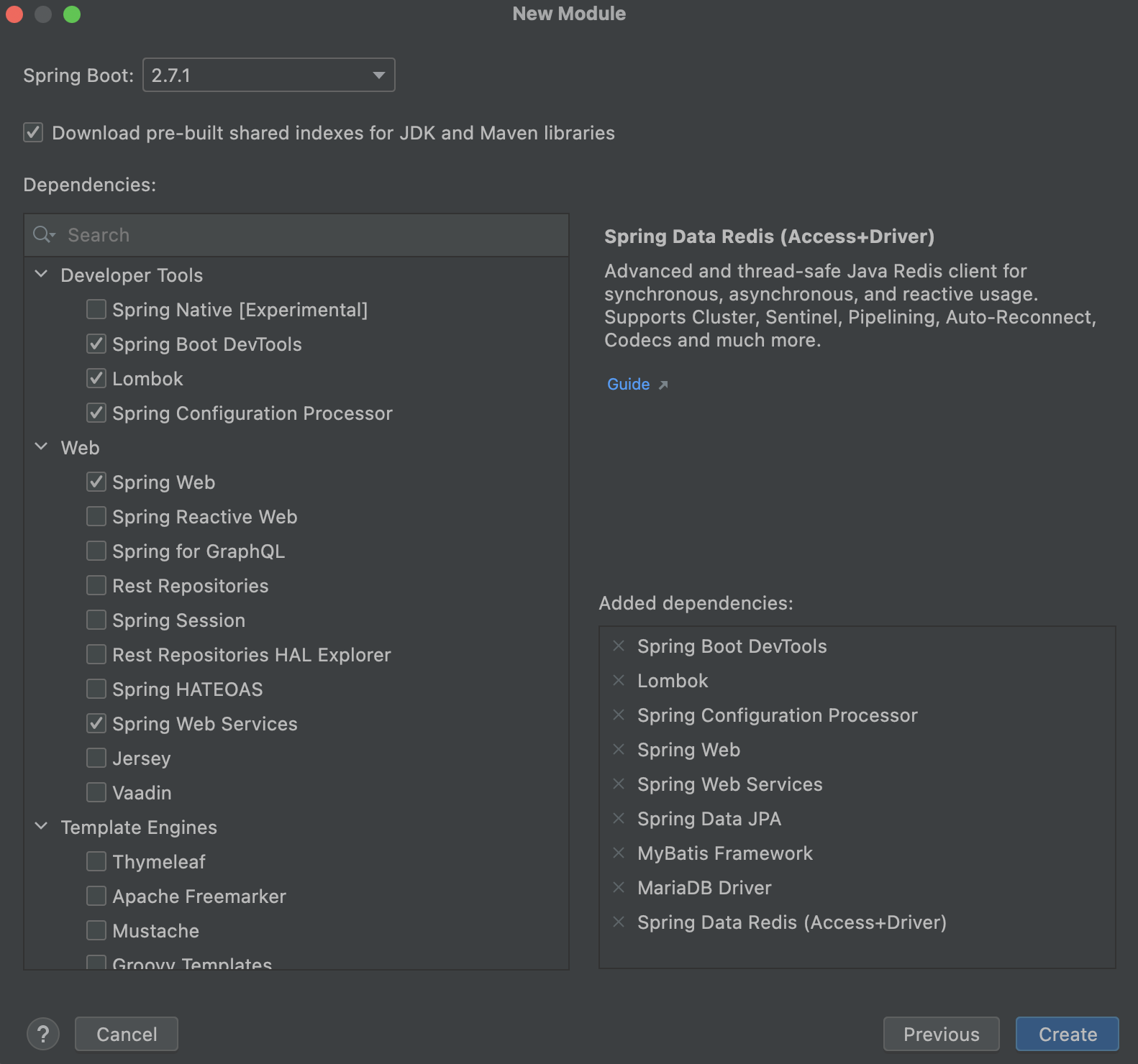 6. Dependencies를 선택해준다. 나중에도 추가가 가능하므로 꼭 여기서 다 해줄 필요는 없다.