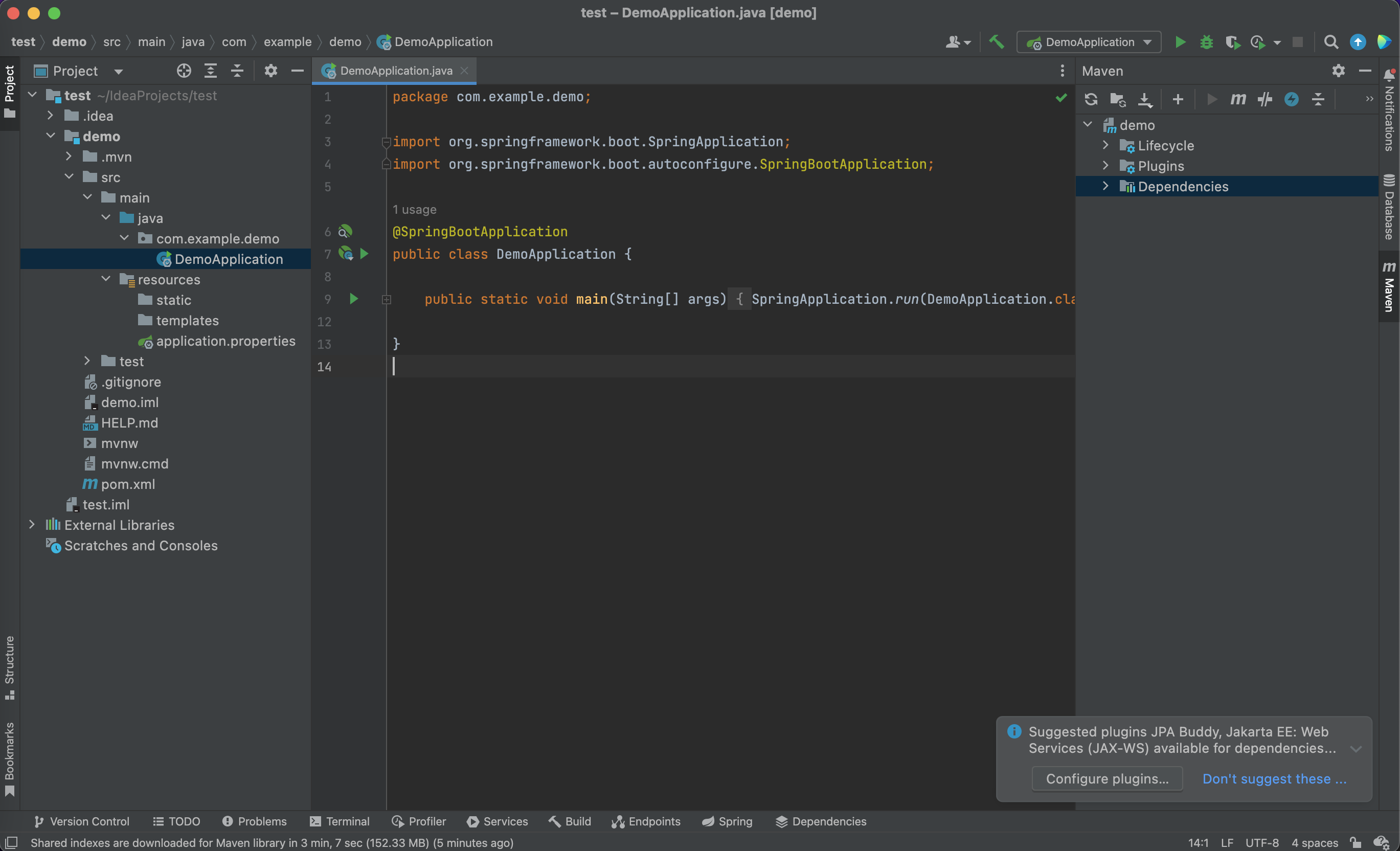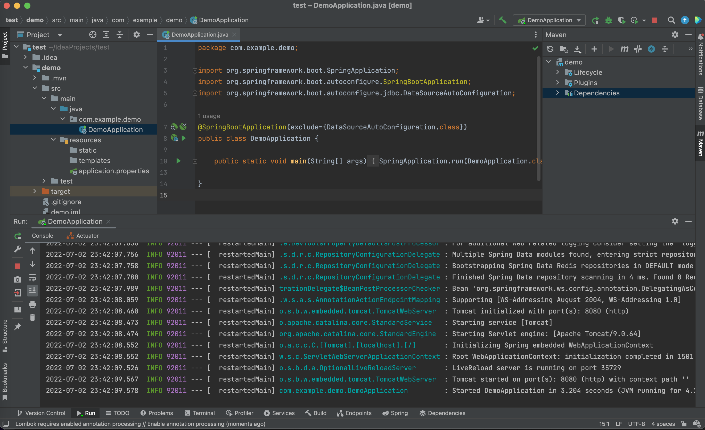 - DemoApplication.java : 스프링부트 컨테이너를 실행하기 위한 main class