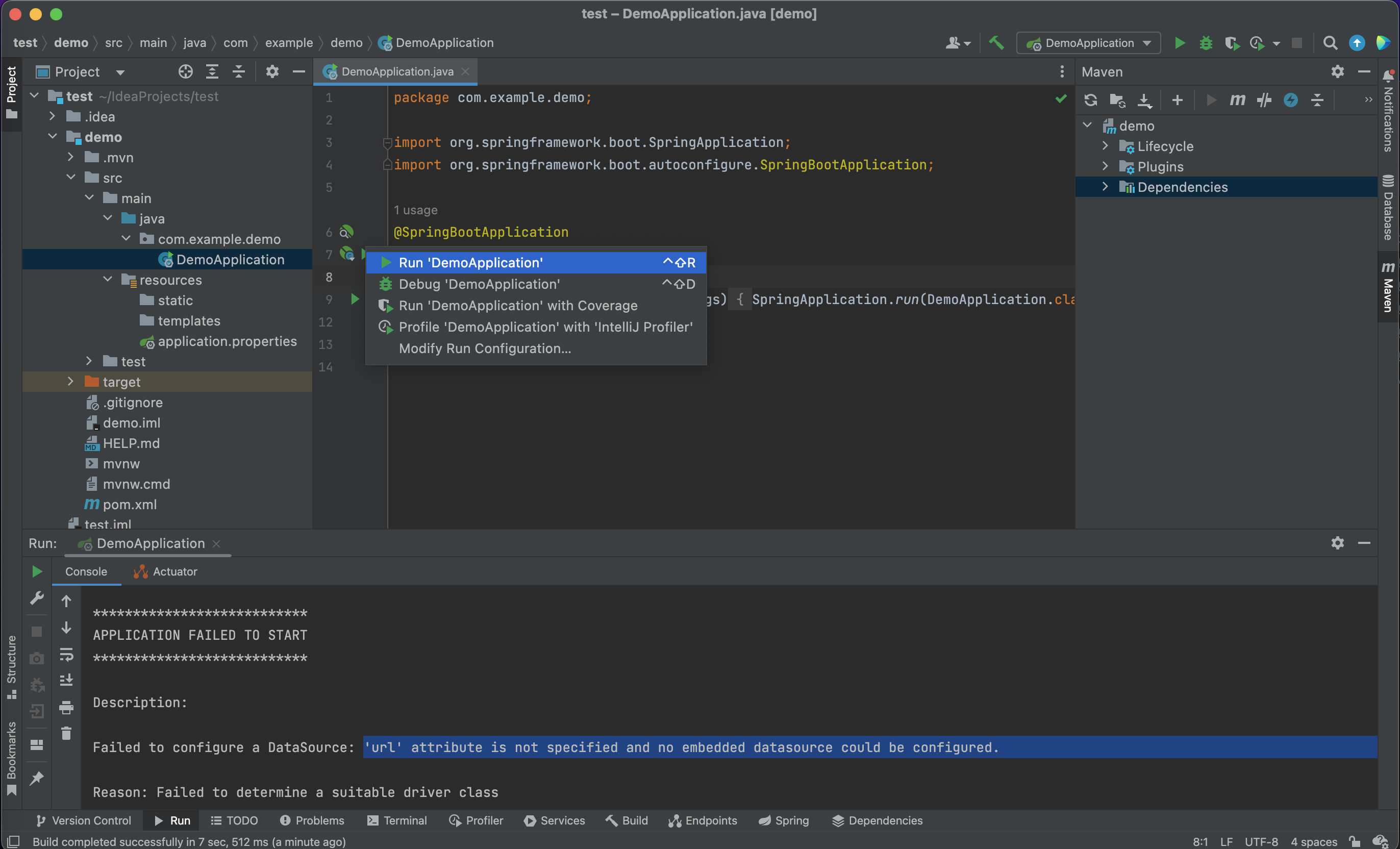 10. Run을 해보면 Failed to configure a DataSource라고 하면서 오류가 뜬다.