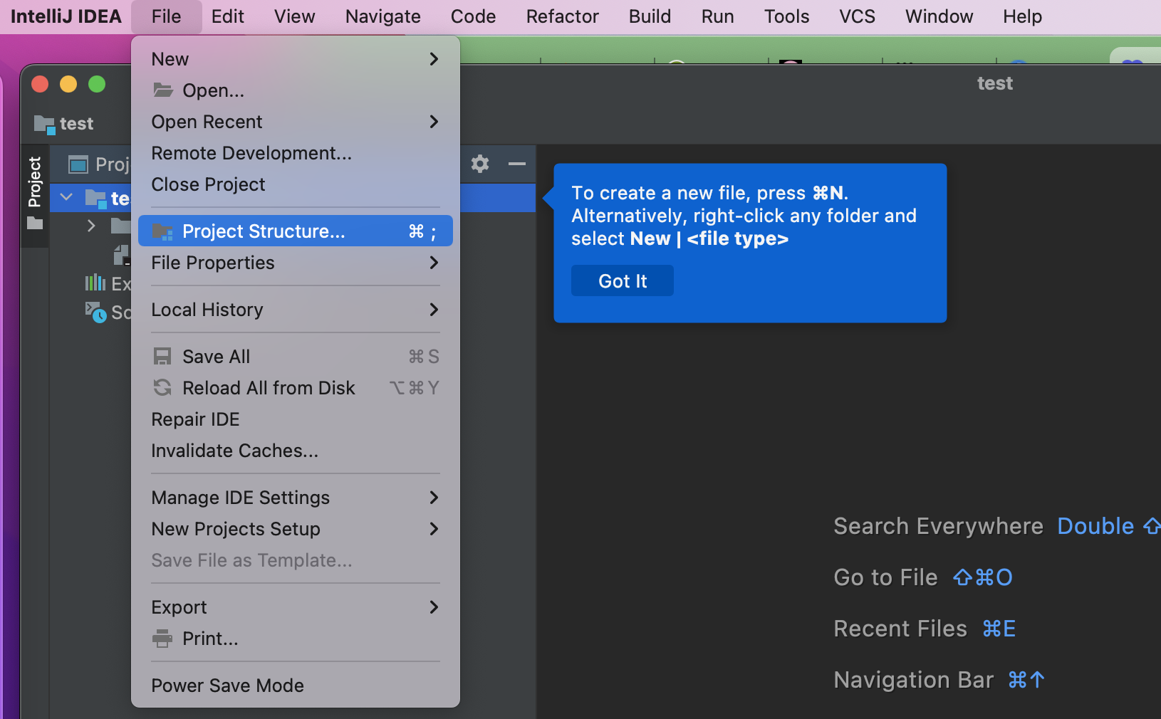 3. 생성 후 상단 메뉴바에서 File - Project Structure를 선택한다.