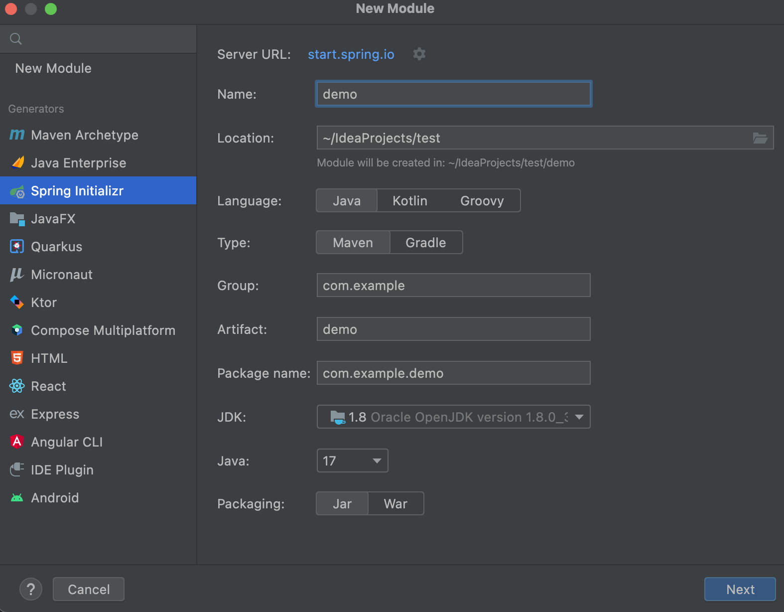 5. Spring initializr 선택 후 원하는 JDK 버전 선택과 이름, 위치 설정 등 진행한다.
