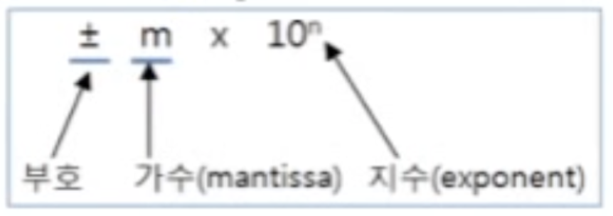 1.2345 -> 0.12345 * 10^1 -> 가수 부분에 12345 저장, 지수 부분에 1 저장.