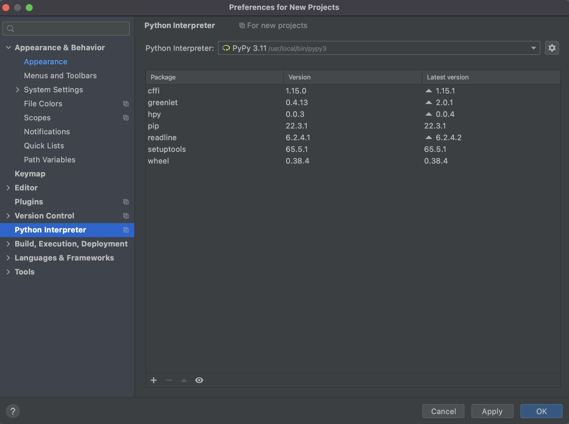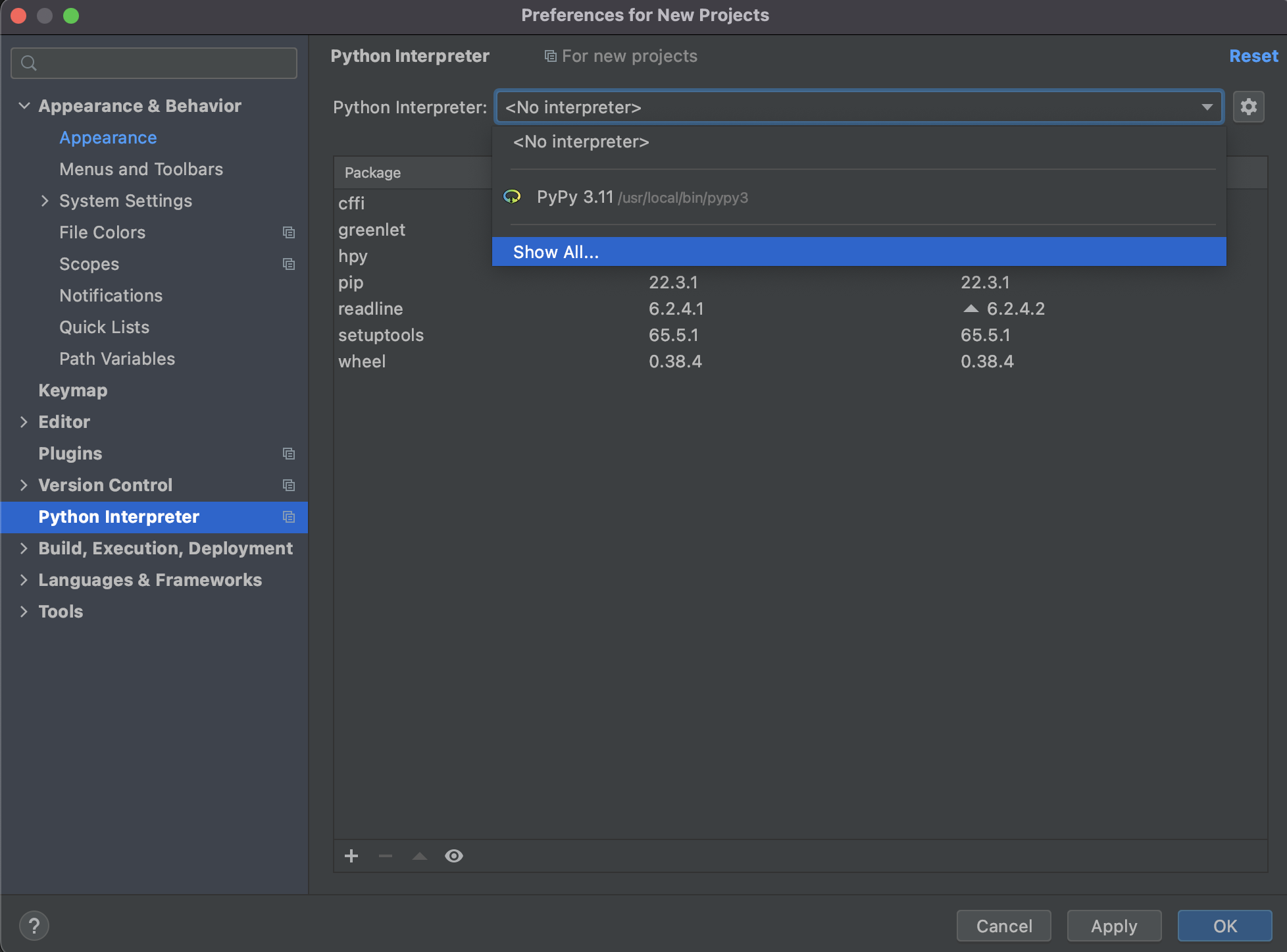 (아마 여러분은 pypy 3.11이 안 떠있을 겁니다. 저는 이미 설정해서 떠 있는 거니 무시해주세요)